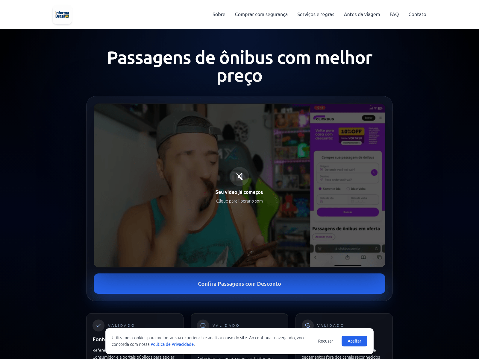 The site displays a page titled “Passagens de onibus com melhor preco | Viaja Brasil”.