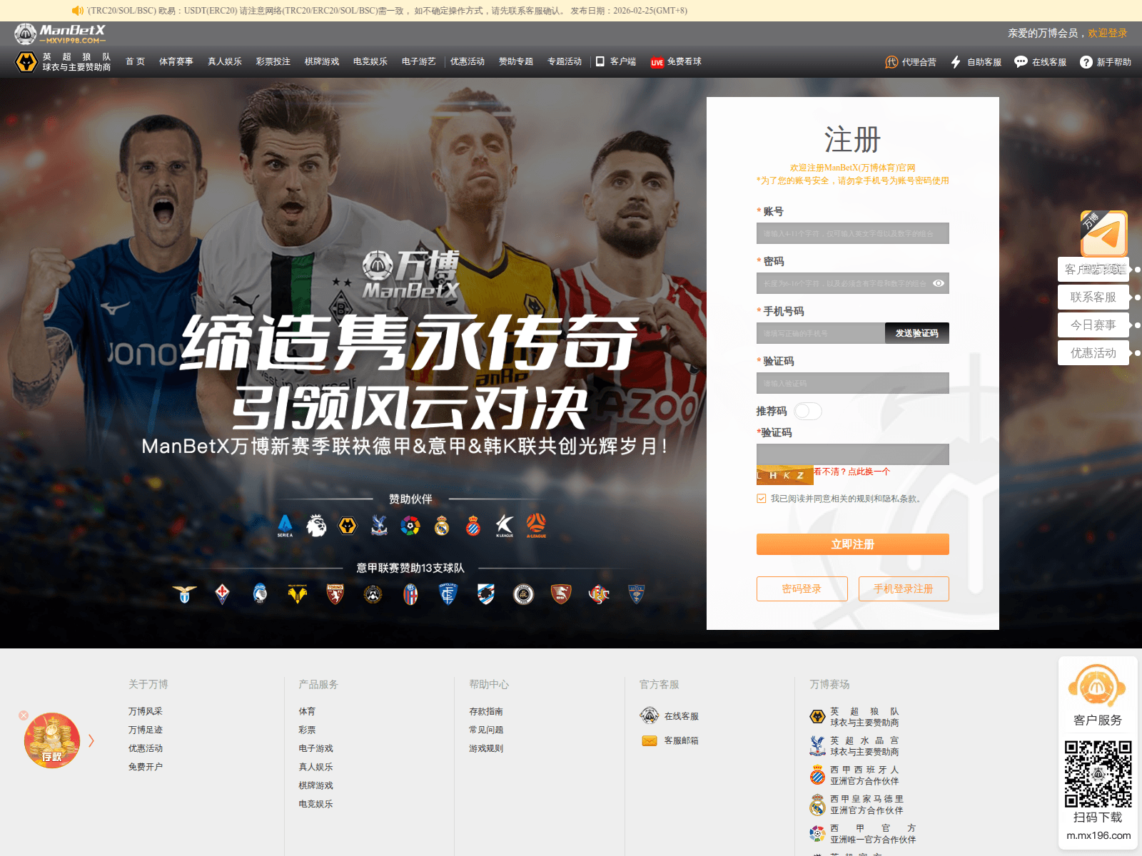 The site displays a page titled “ManBetX(万博体育)官网|英超狼队和水晶宫全球赞助伙伴”.
