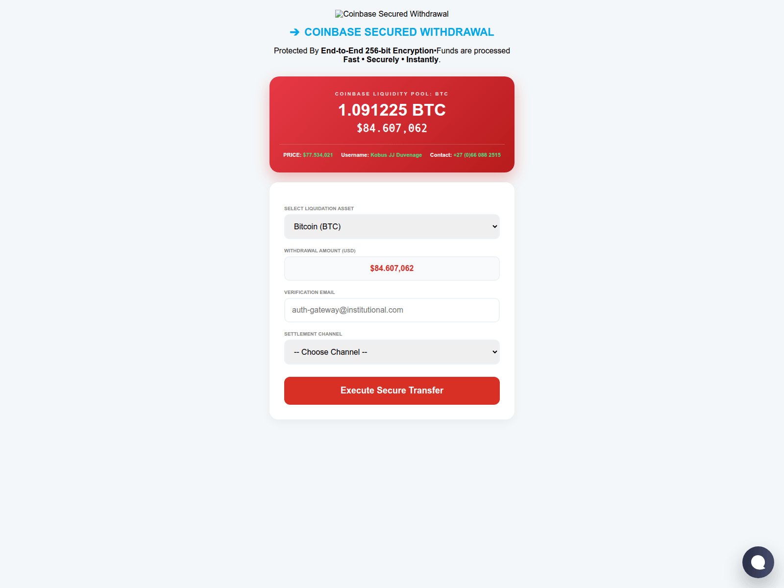 The site displays a page titled “Coinbase Secured Withdrawal”, which may be designed to impersonate Coinbase.