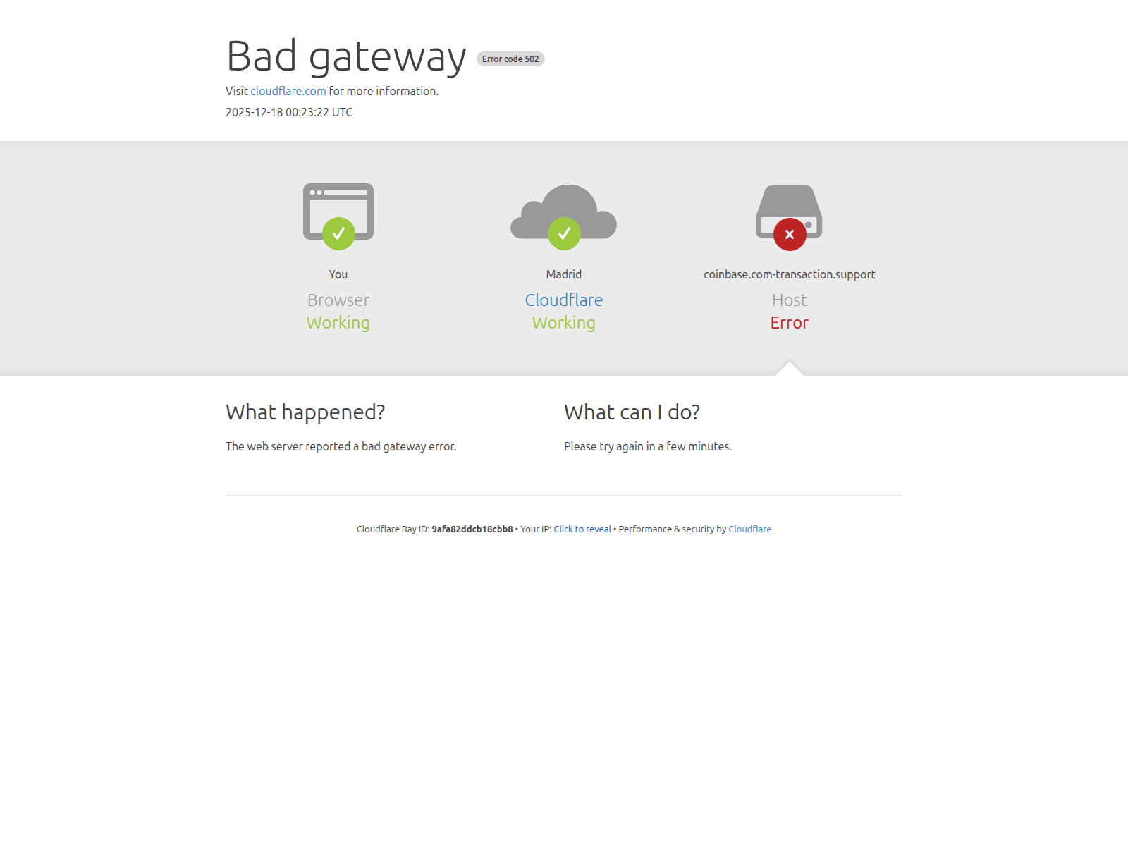 The site displays a page titled “com-transaction.support | 502: Bad gateway”, which may be designed to impersonate Coinbase.