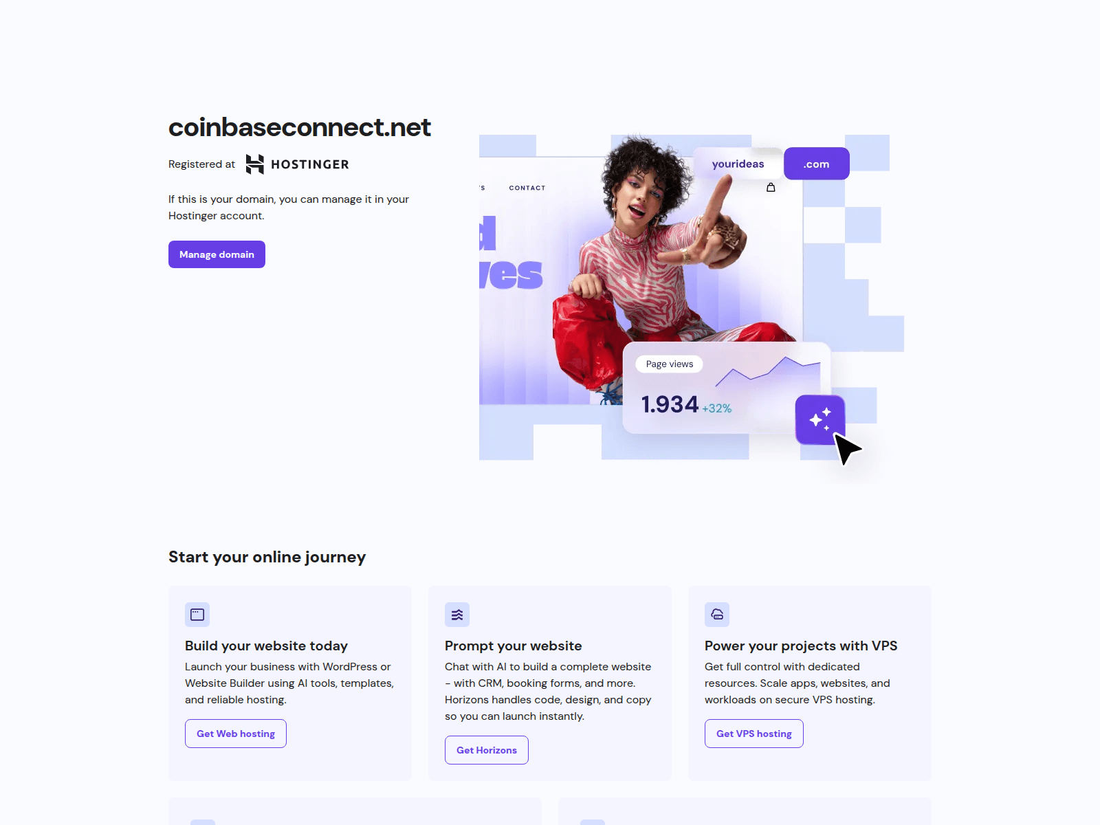 The site displays a page titled “Parked Domain name on Hostinger DNS system”, which may be designed to impersonate coinbase.