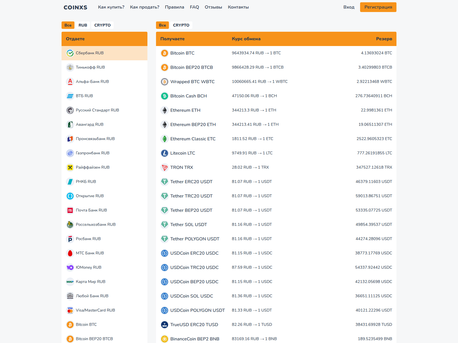 The site displays a page titled “Обменник криптовалют COINXS ✔️ - выгодные курсы обмена, без комиссии, без регистрации, быстро и б...”.