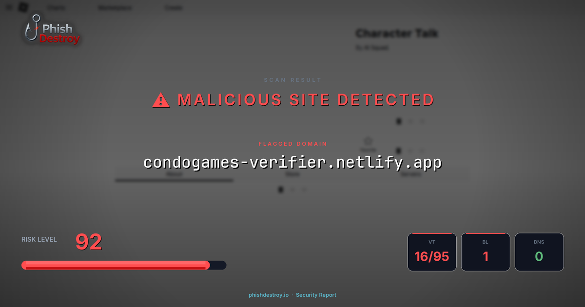 This domain security report for condogames-verifier.netlify.app is maintained by PhishDestroy's automated threat intelligence pipeline. Our system continuously monitors this domain across 16 security vendors on VirusTotal, 1 public blocklists, URLScan.io.