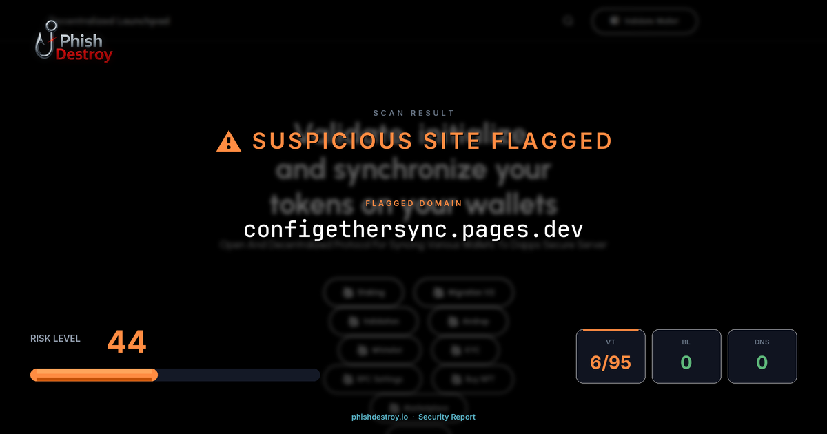 configethersync.pages.dev has been flagged by 6 security vendors as of March 16, 2026.