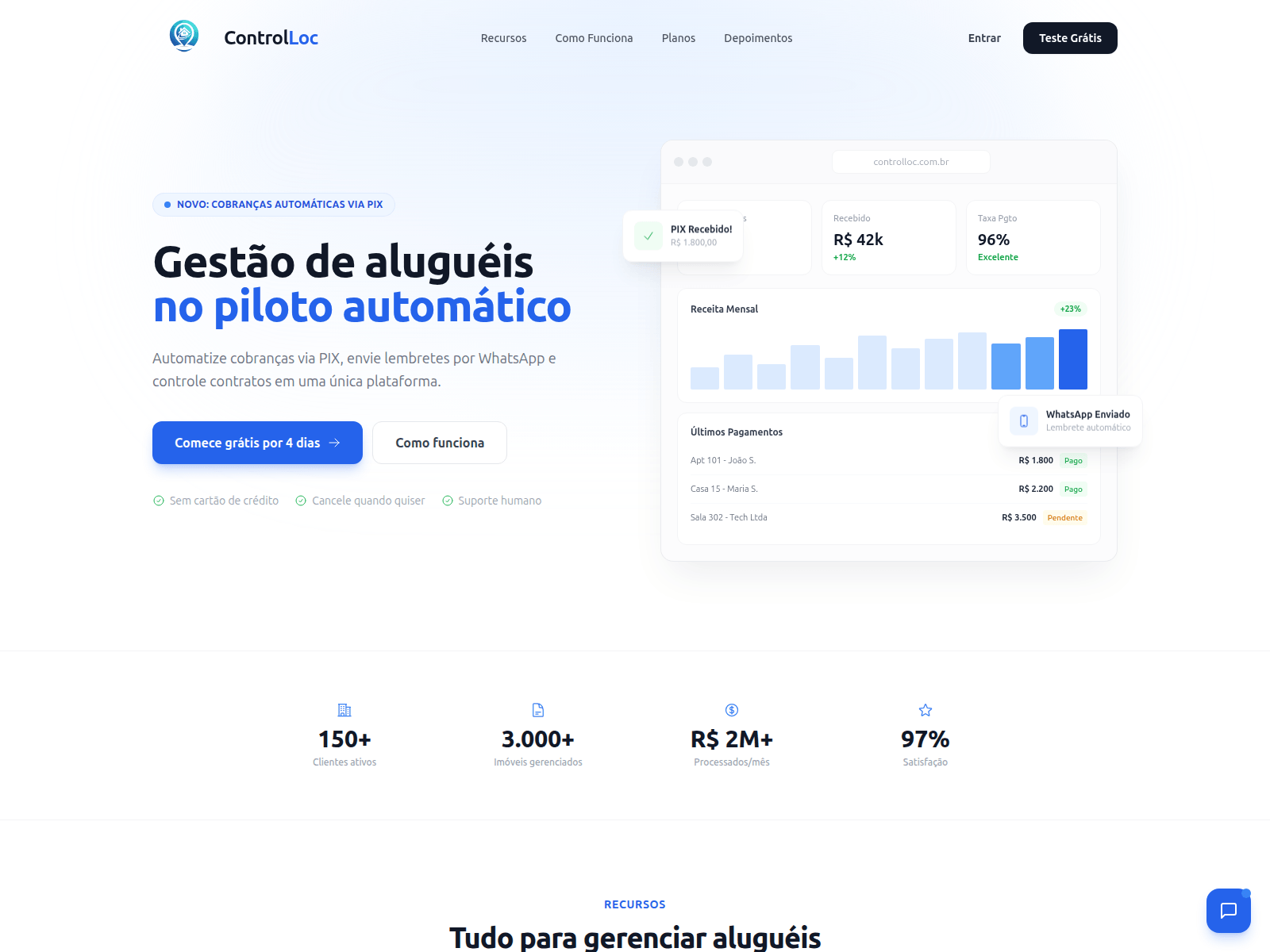 The site displays a page titled “ControlLoc - Sistema de Gestão de Aluguéis para Imobiliárias”.