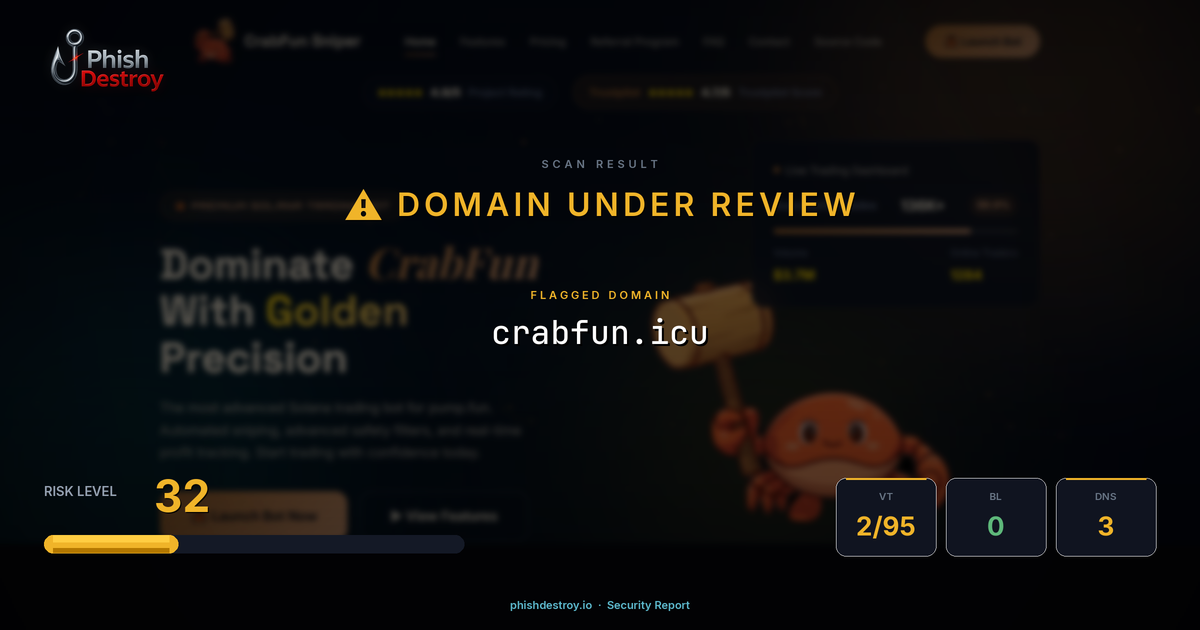 The domain crabfun[.]icu has been identified as a cryptocurrency phishing website. This malicious site targets Web3 users by mimicking legitimate crypto platforms to steal wallet credentials and digital assets.