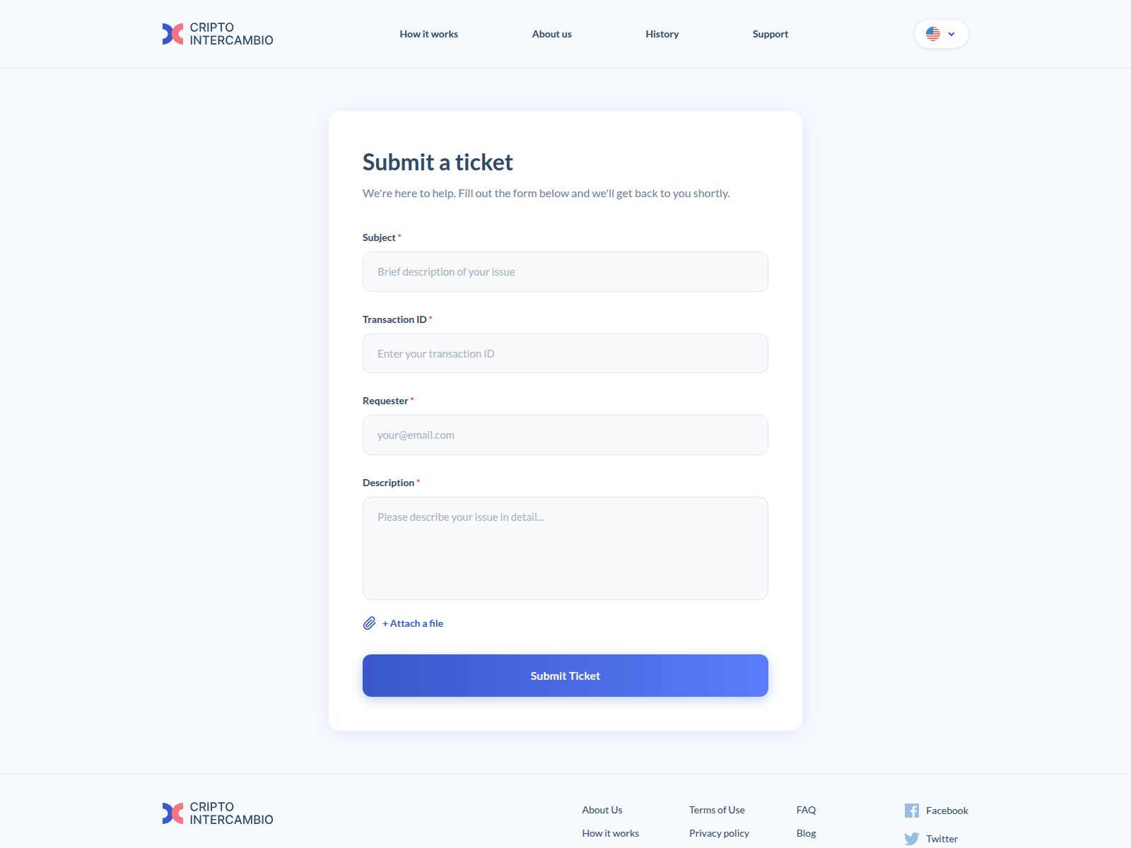 The site displays a page titled “Submit a Support Ticket | Criptointercambio”.