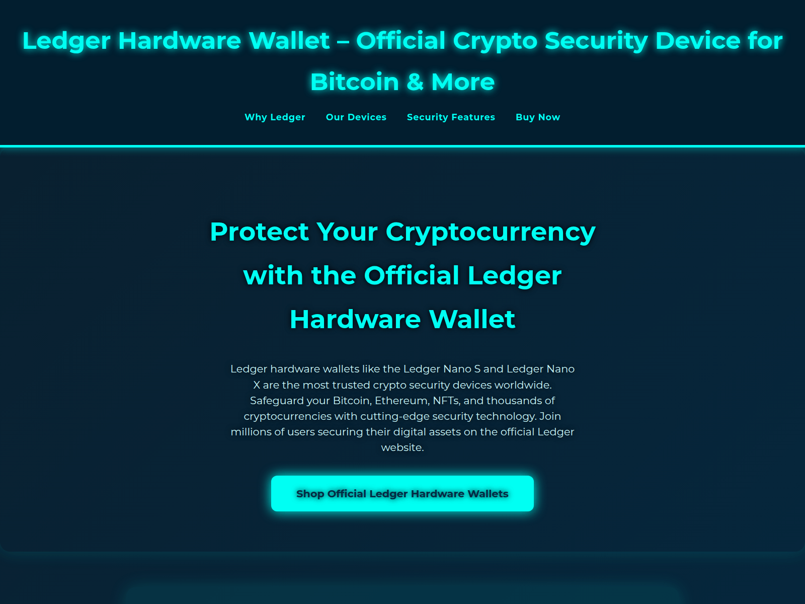 The site displays a page titled “Ledger Hardware Wallet – Official Crypto Security Device for Bitcoin & More”, which may be designed to impersonate Ledger.