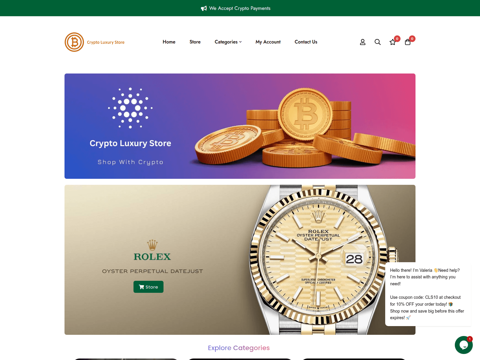 The site displays a page titled “Crypto Luxury Store | Shop With Crypto”.
