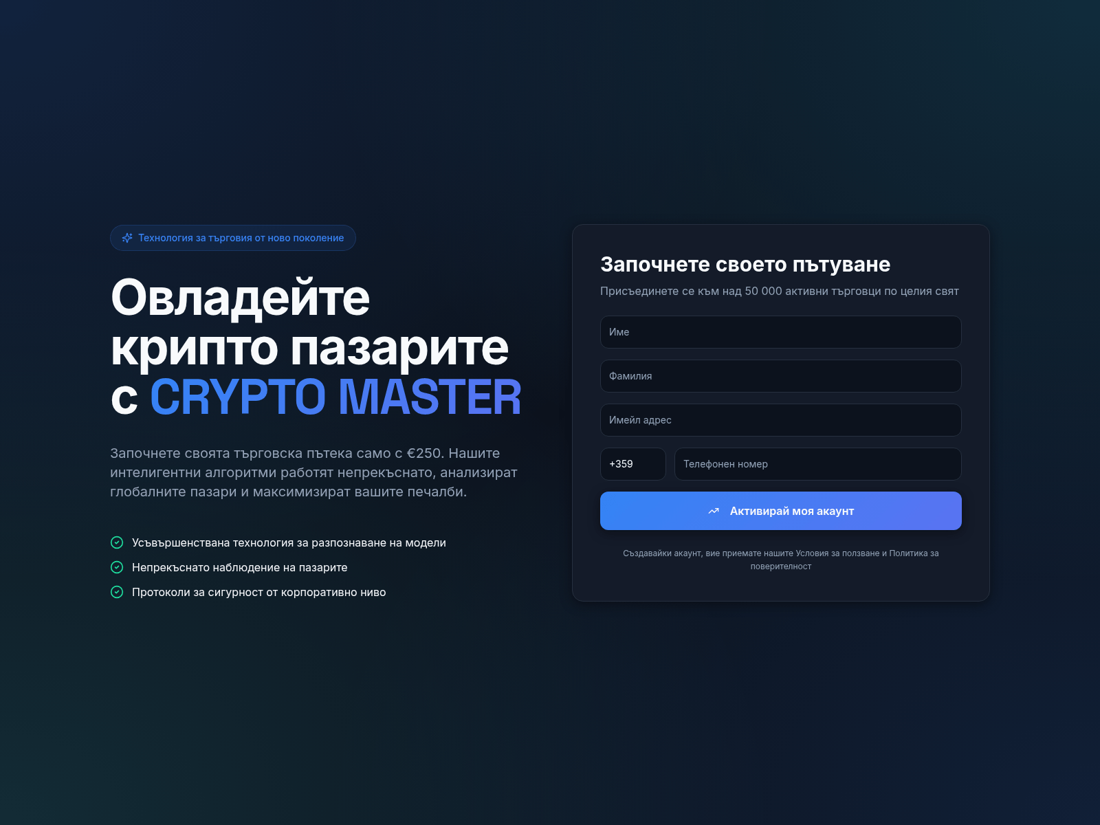 The site displays a page titled “CRYPTO MASTER - Започнете да търгувате с интелигентен ИИ”.