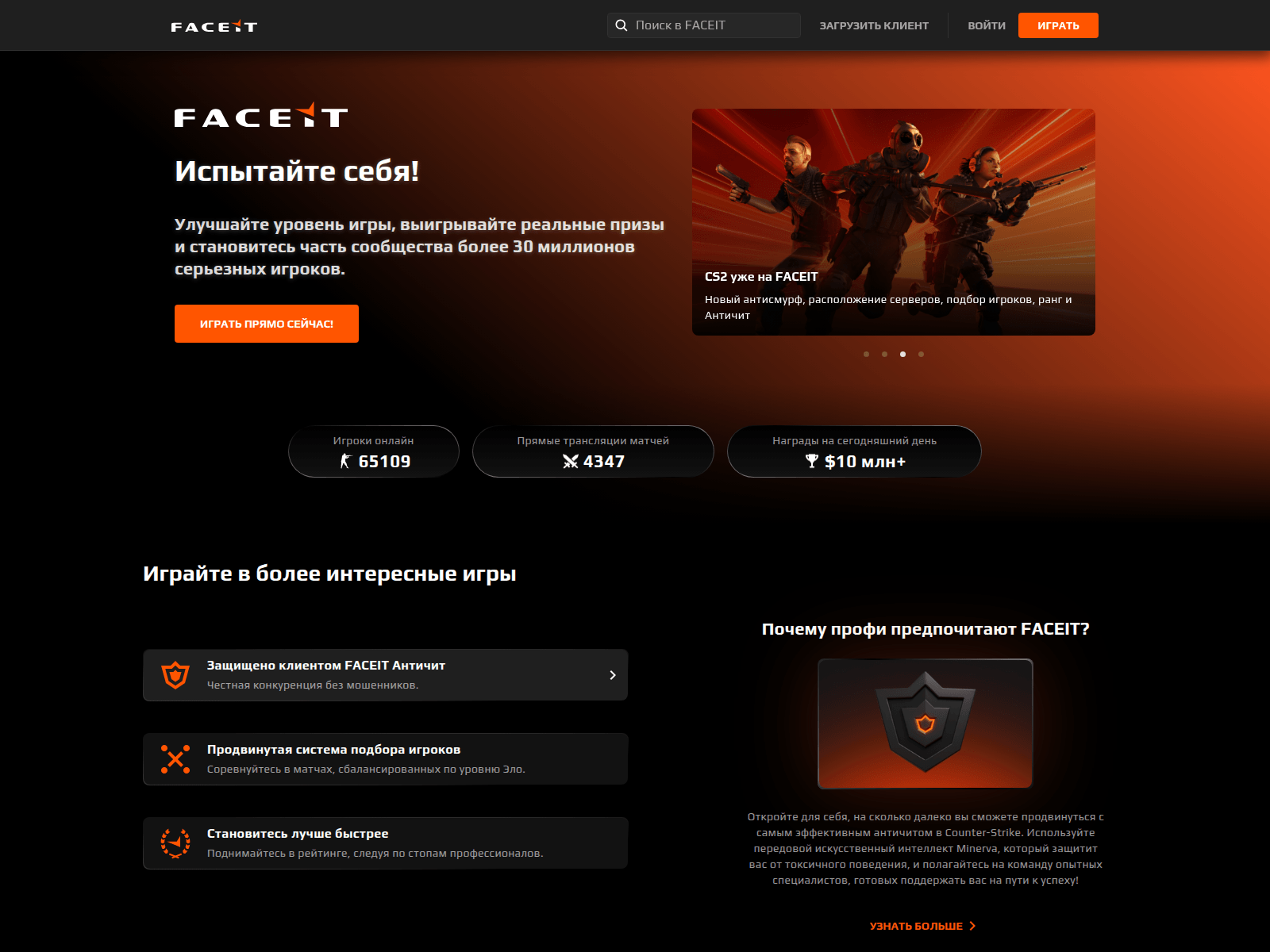 The site displays a page titled “FACEIT - Играй на настойщих серверах!”.