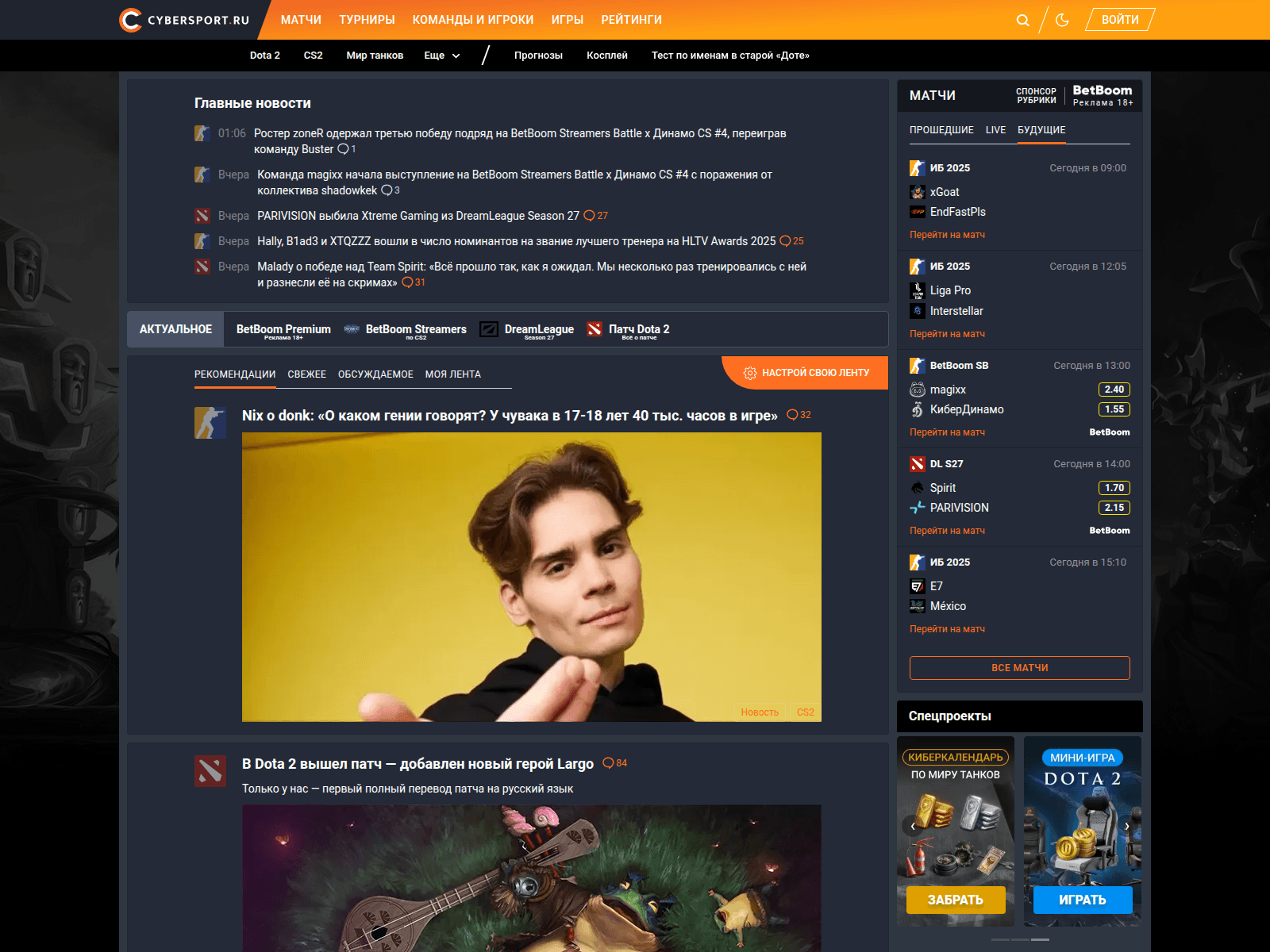 The site displays a page titled “CYBERSPORT.ru - Киберспорт и Игры, Новости, Турниры, расписание матчей, рейтинги команд и игроков...”.
