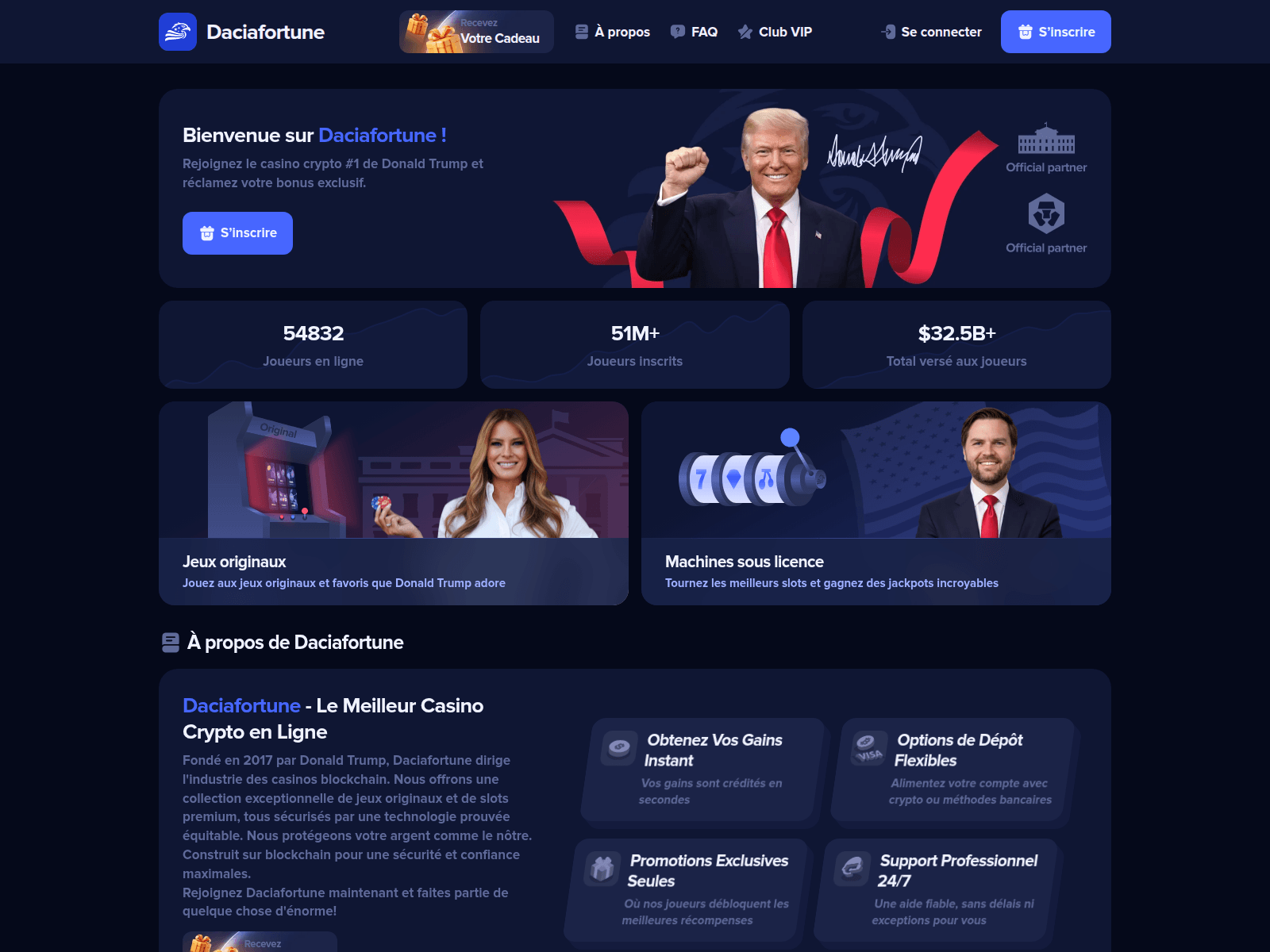 The site displays a page titled “Daciafortune: Donald Trump’s Leading Blockchain Crypto Casino”.