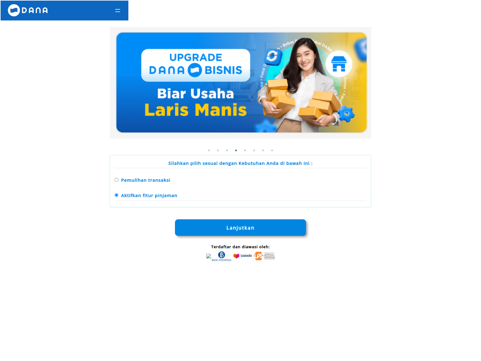 The site displays a page titled “DANA - Apa pun transaksinya selalu ada DANA”.