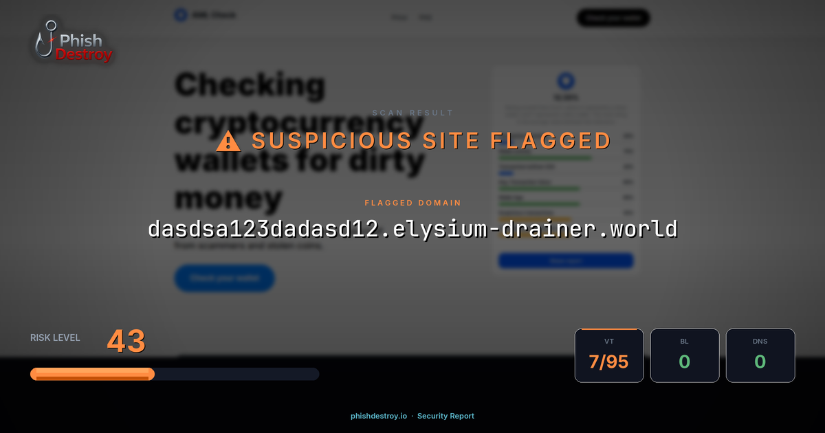 The domain dasdsa123dadasd12[.]elysium-drainer[.]world has been identified as a cryptocurrency phishing website. This malicious site targets Web3 users by mimicking legitimate crypto platforms to steal wallet credentials and digital assets.