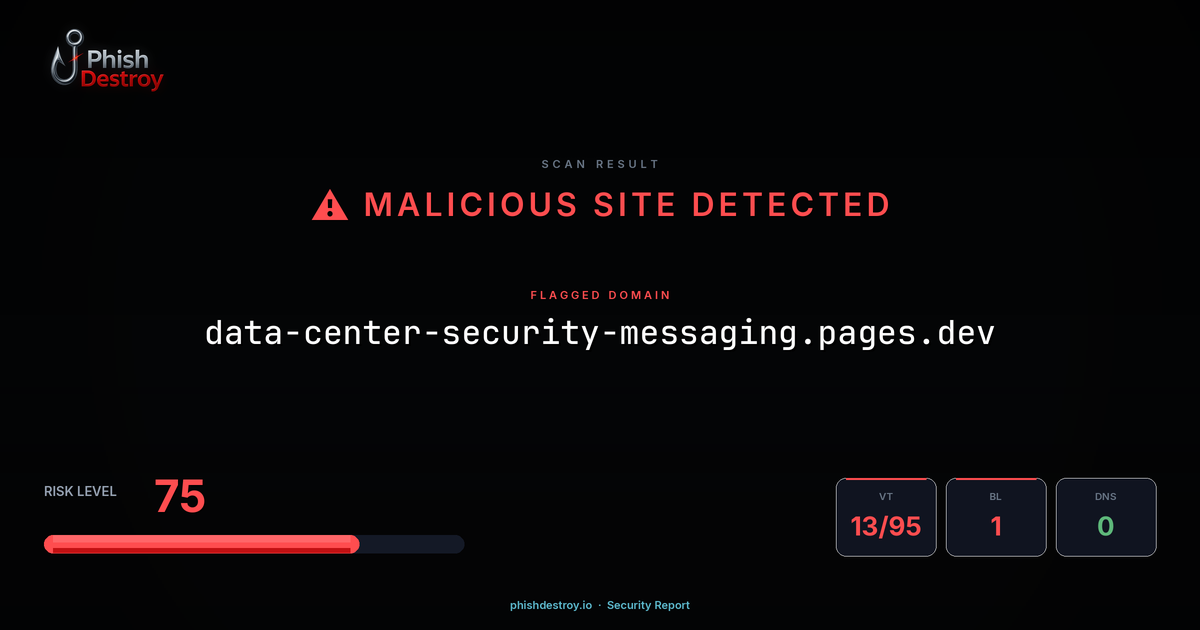 data-center-security-messaging.pages.dev has been flagged by 13 security vendors as of March 16, 2026.