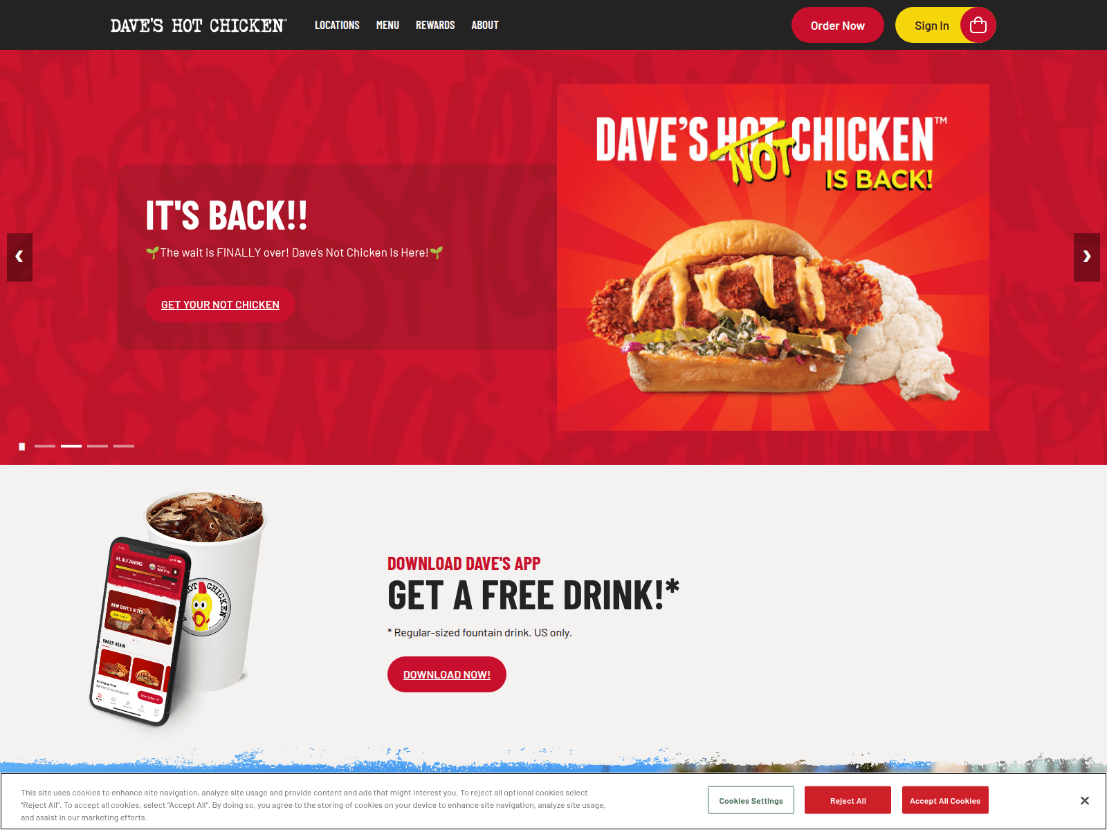 The site displays a page titled “Home | Dave's Hot Chicken”, which may be designed to impersonate Aave.