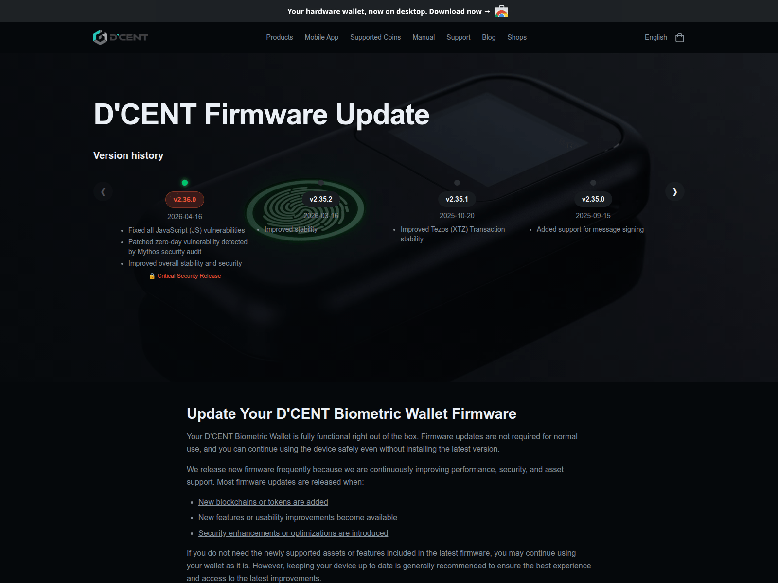 The site displays a page titled “D'CENT Biometric Wallet Firmware Update – v2.36.0”.