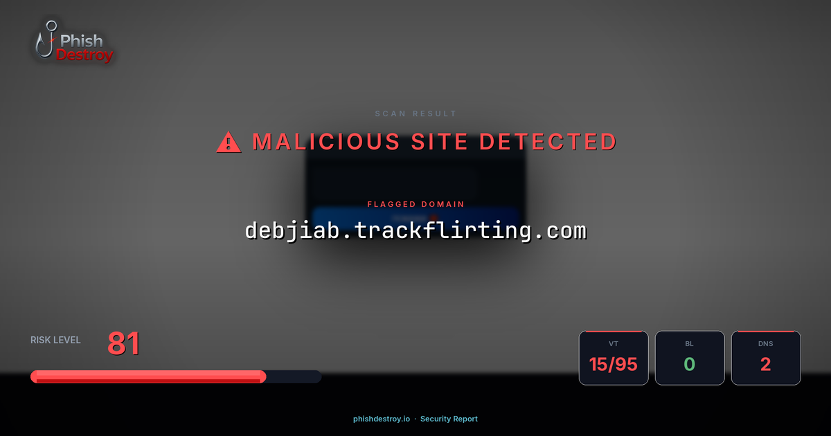 This domain security report for debjiab.trackflirting.com is maintained by PhishDestroy's automated threat intelligence pipeline. Our system continuously monitors this domain across 15 security vendors on VirusTotal, 1 public blocklists.