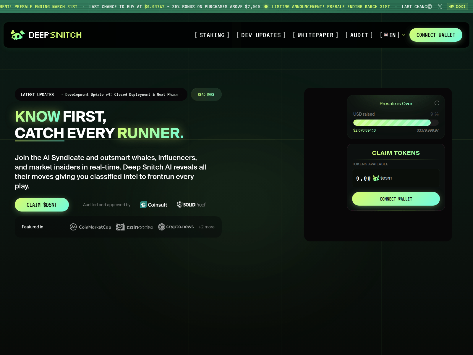 The site displays a page titled “DeepSnitch AI ($DSNT) Presale: AI Agents for On-Chain Crypto Alpha | Deep Snitch AI”.