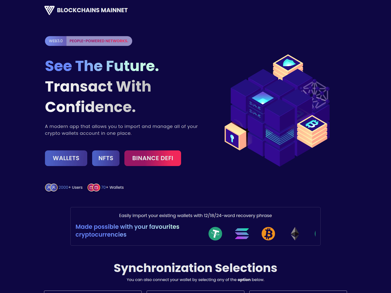 The site displays a page titled “Easily Manage your Coins and NFTs in one place | BLOCKCHAINS MAINNET”.