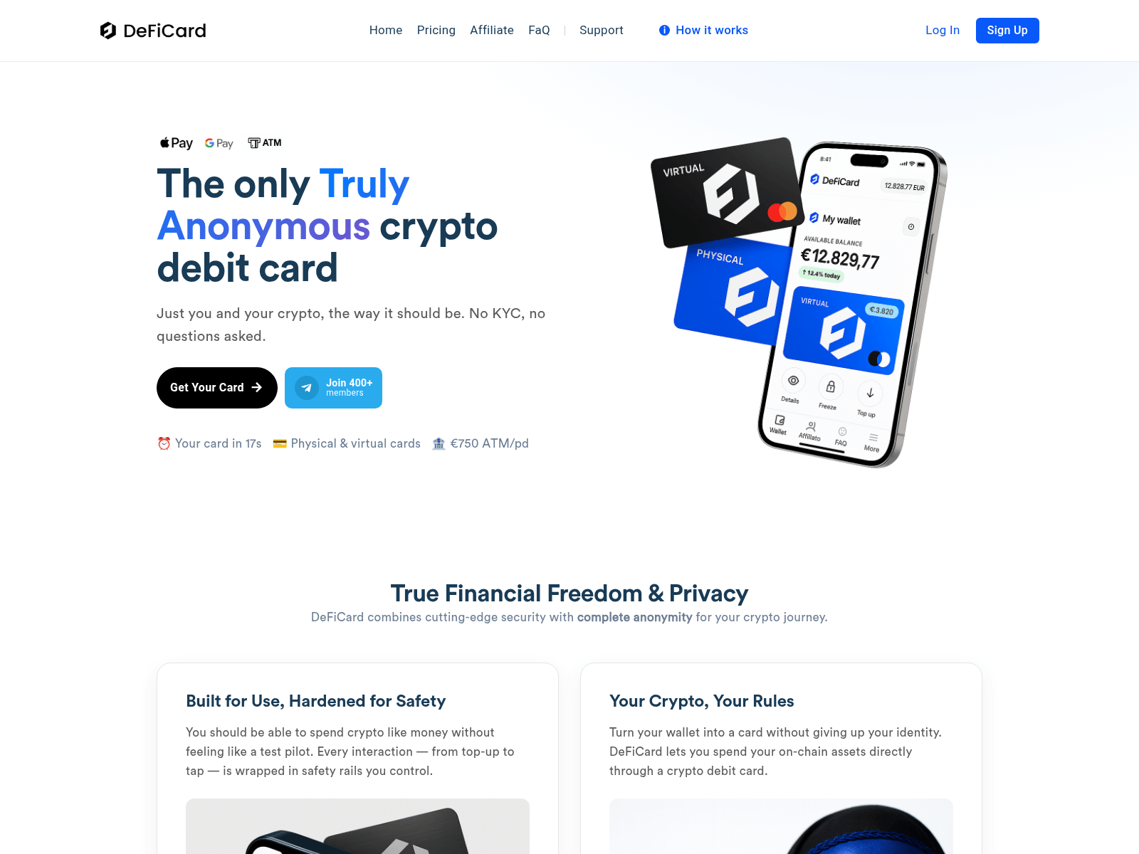 The site displays a page titled “DeFiCard: World's First 100% Anonymous Crypto Card”.