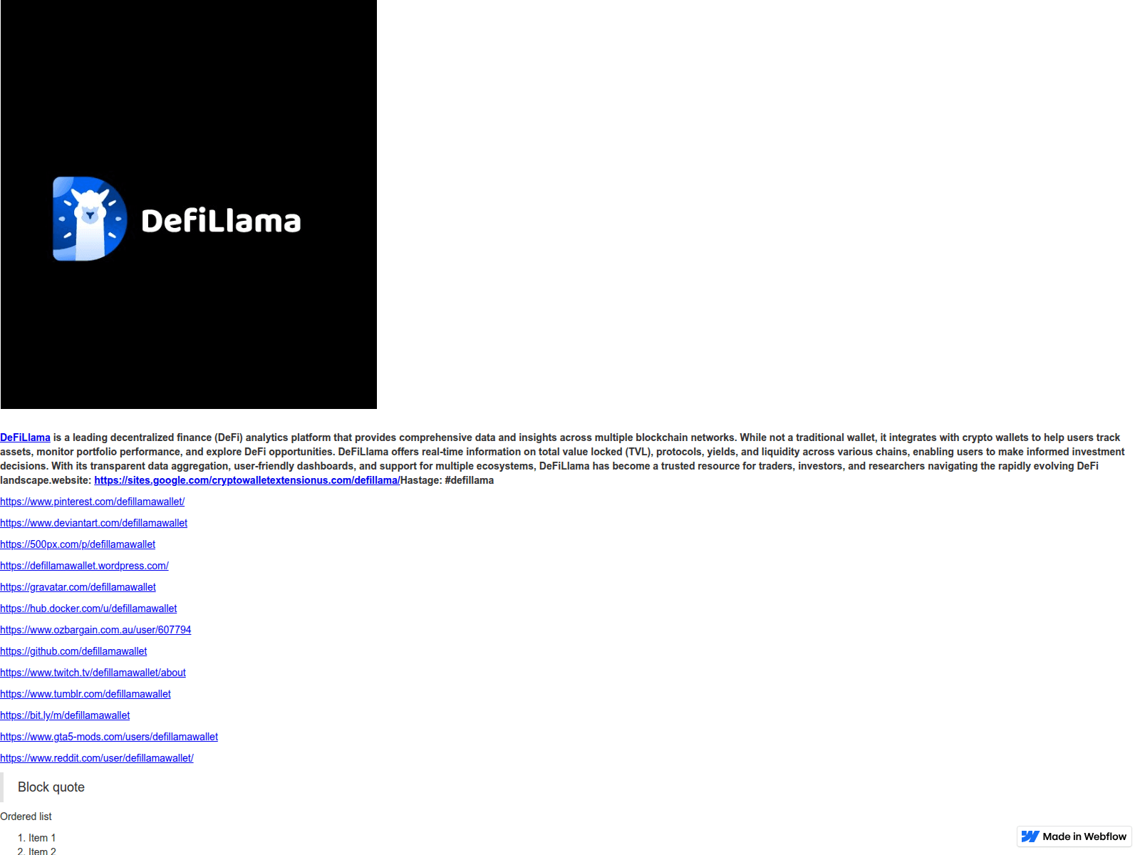 This domain security report for defillama-4e386f.webflow.io is maintained by PhishDestroy's automated threat intelligence pipeline. Our system continuously monitors this domain across 1 security vendors on VirusTotal, 3 public blocklists.