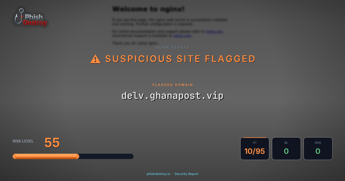 This domain security report for delv.ghanapost.vip is maintained by PhishDestroy's automated threat intelligence pipeline. Our system continuously monitors this domain across 10 security vendors on VirusTotal, 1 public blocklists.