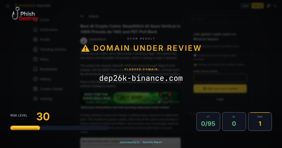 The domain dep26k-Binance[.]com has been identified as a phishing website designed to impersonate Binance. This malicious site targets cryptocurrency users by creating a convincing replica of the legitimate Binance platform.