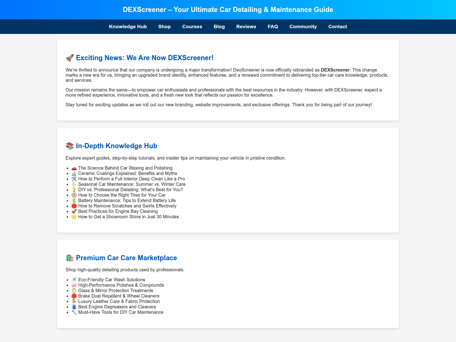 The site displays a page titled “DEXScreener – The Ultimate Car Care Hub”.