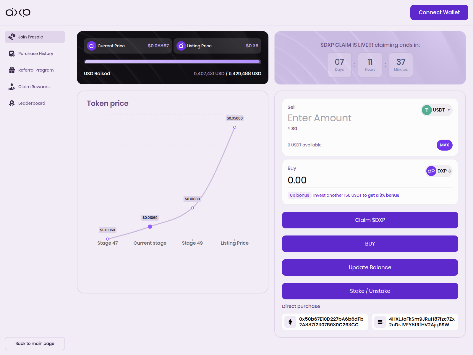 The site displays a page titled “Join the DEXRP Presale – Be Part of the Future of Decentralized Trading”.