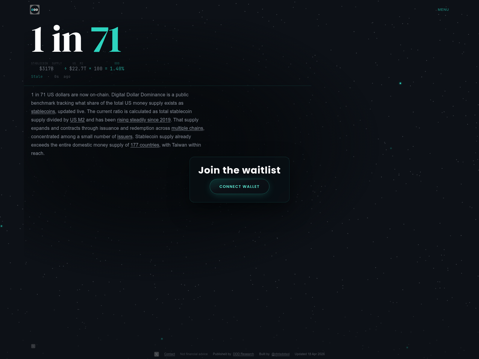 The site displays a page titled “Digital Dollar Dominance | Stablecoin market cap as a percentage of US M2”.
