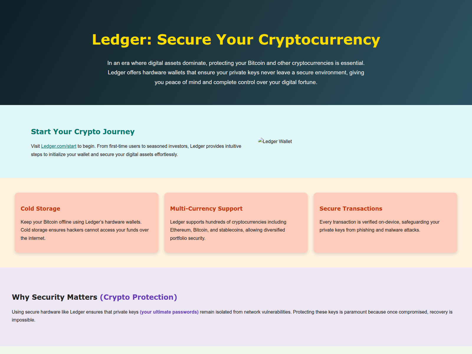 The site displays a page titled “Ledger & Crypto Security”, which may be designed to impersonate Ledger.