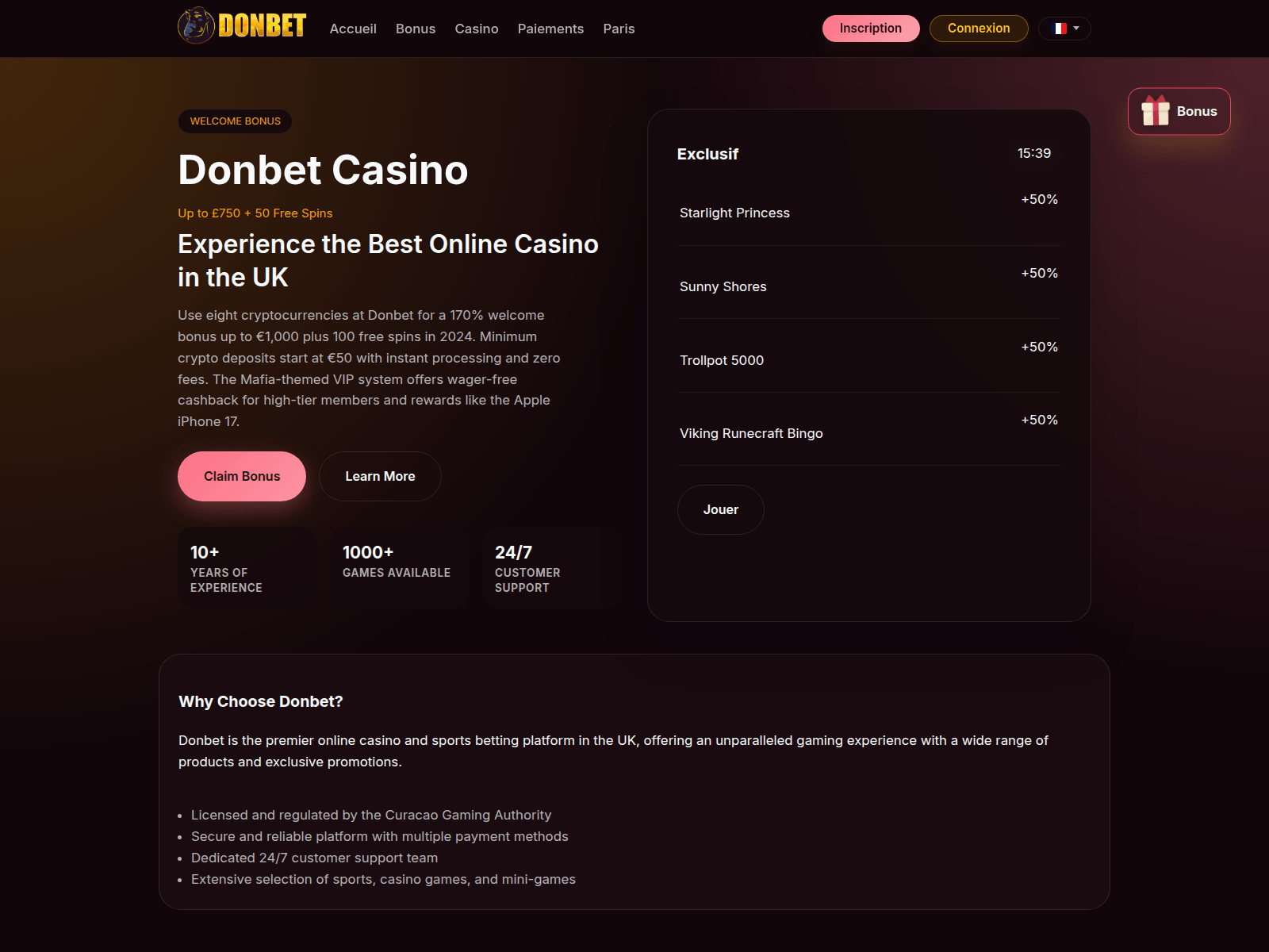 The site displays a page titled “Donbet Casino - Legit and Safe Casino in UK with Bonus €750”.