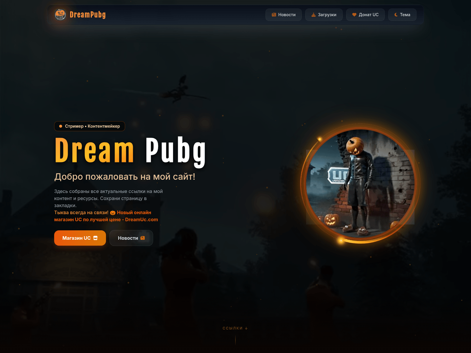 The site displays a page titled “Официальный сайт - Dream Pubg”.