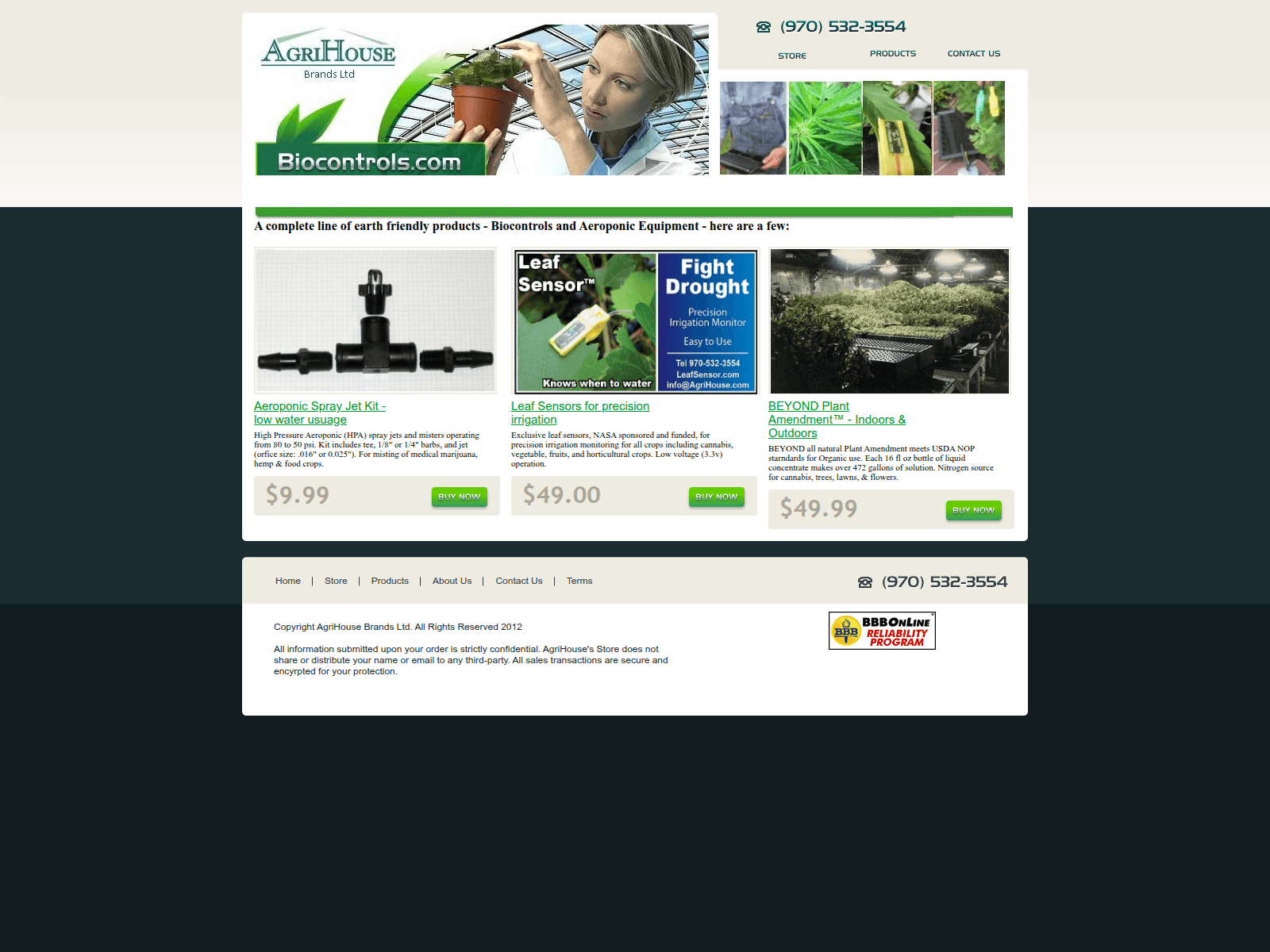 The site displays a page titled “BioControls.com all natural biopesticides and aeroponics.. finally, an alternative”.