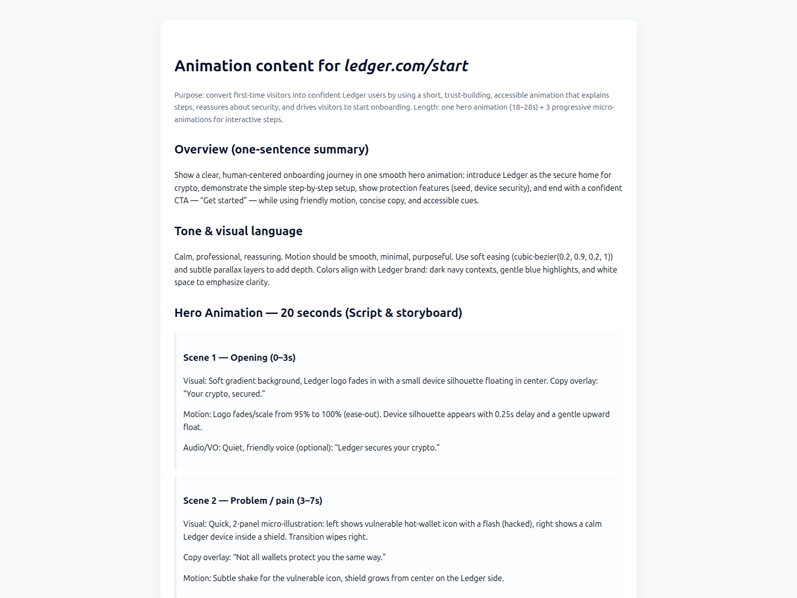 “Ledger Start — Secure your crypto: onboarding animation brief & content”