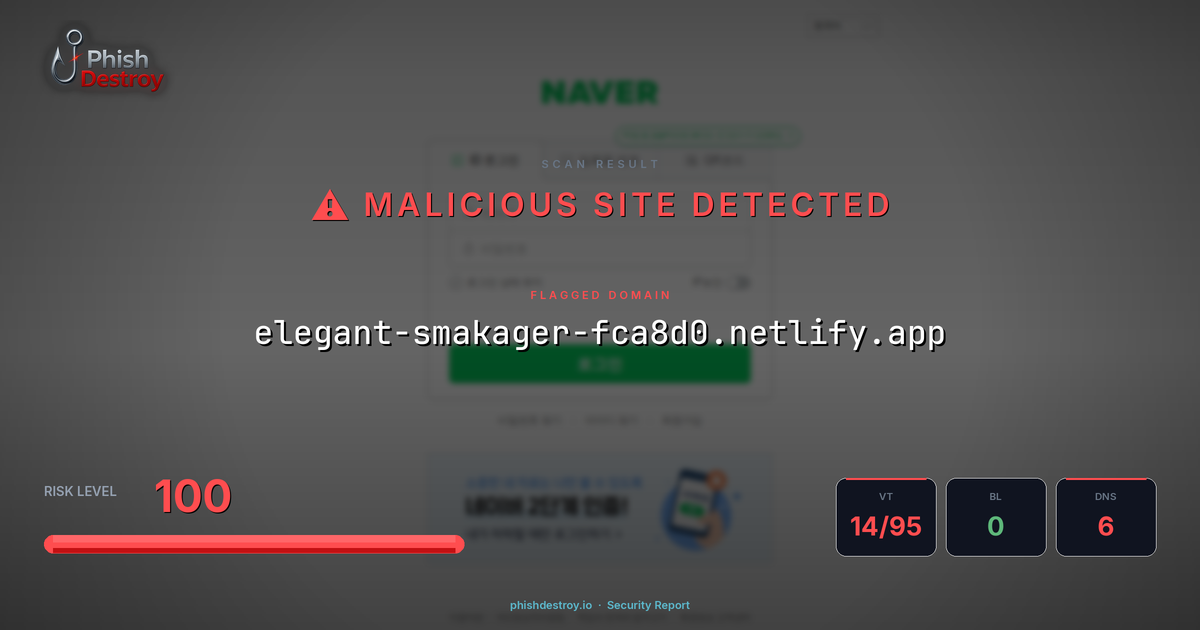 elegant-smakager-fca8d0.netlify.app has been flagged by 14 security vendors as of March 16, 2026.