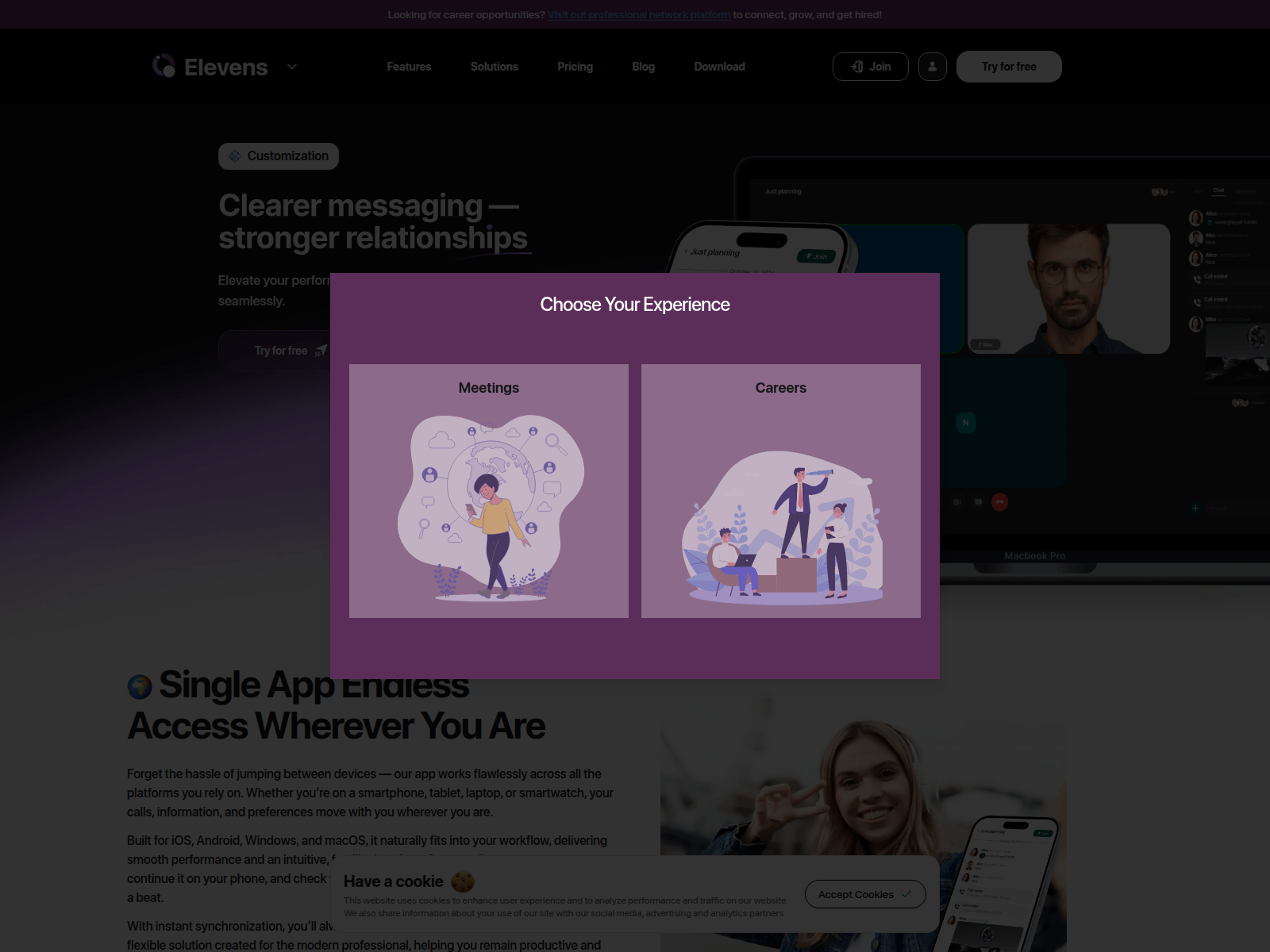 The site displays a page titled “Clearer messaging — stronger relationships | Elevens”, which may be designed to impersonate across.