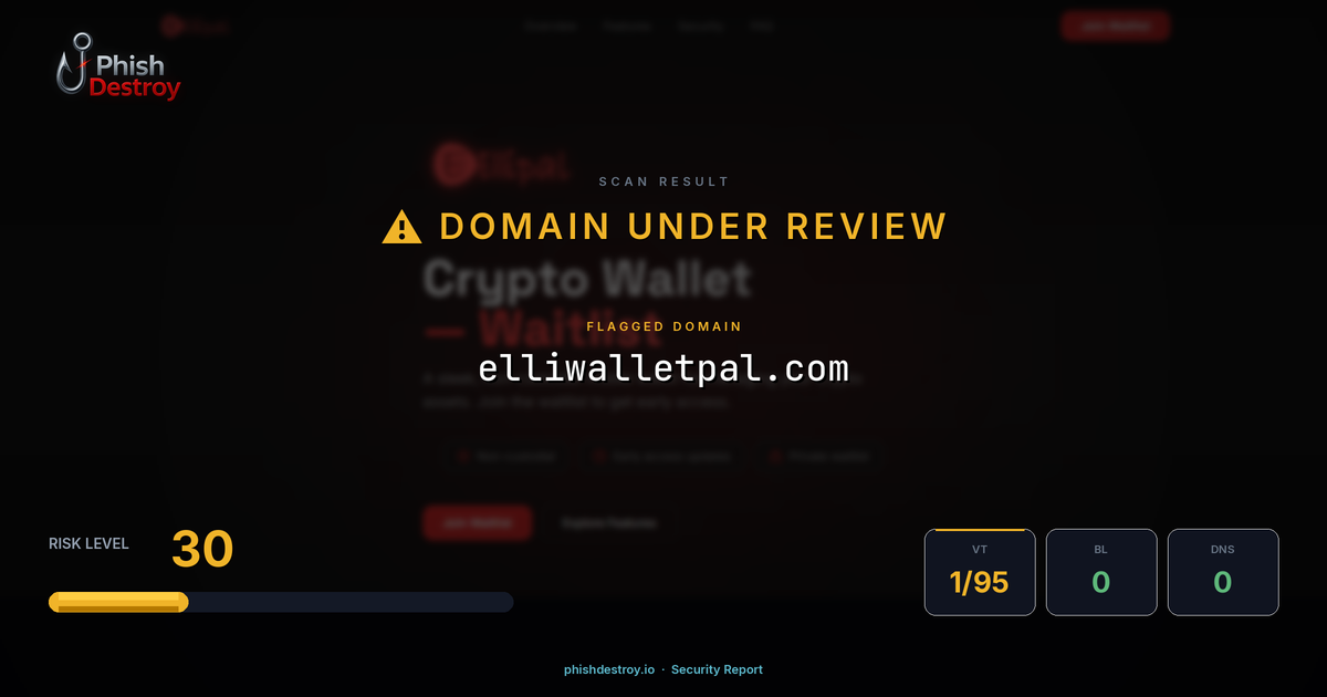 This domain security report for elliwalletpal.com is maintained by PhishDestroy's automated threat intelligence pipeline. Our system continuously monitors this domain across 1 security vendors on VirusTotal, 1 public blocklists.