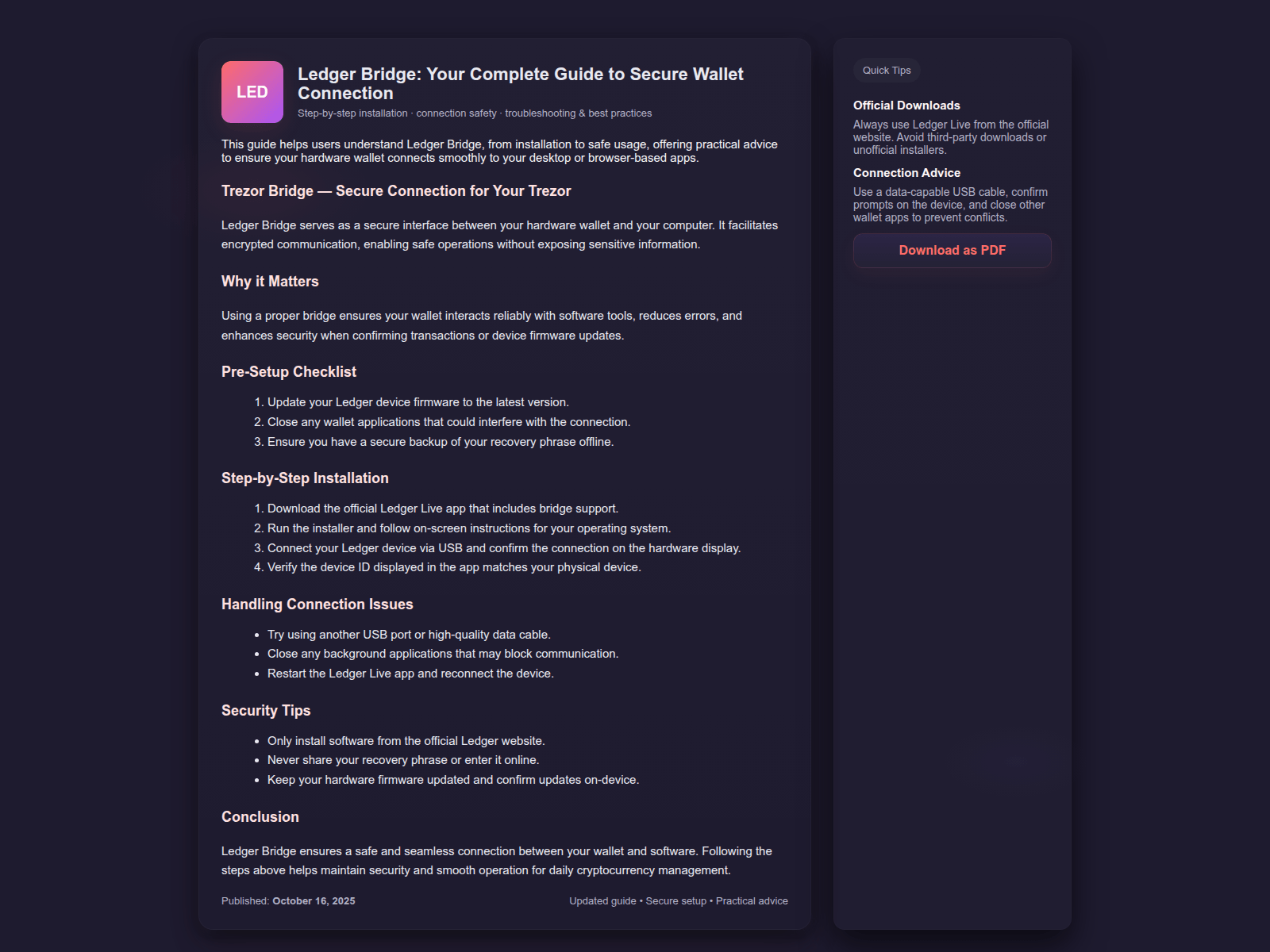 - Use a hardware wallet (Ledger, Trezor). Never store large amounts in browser wallets