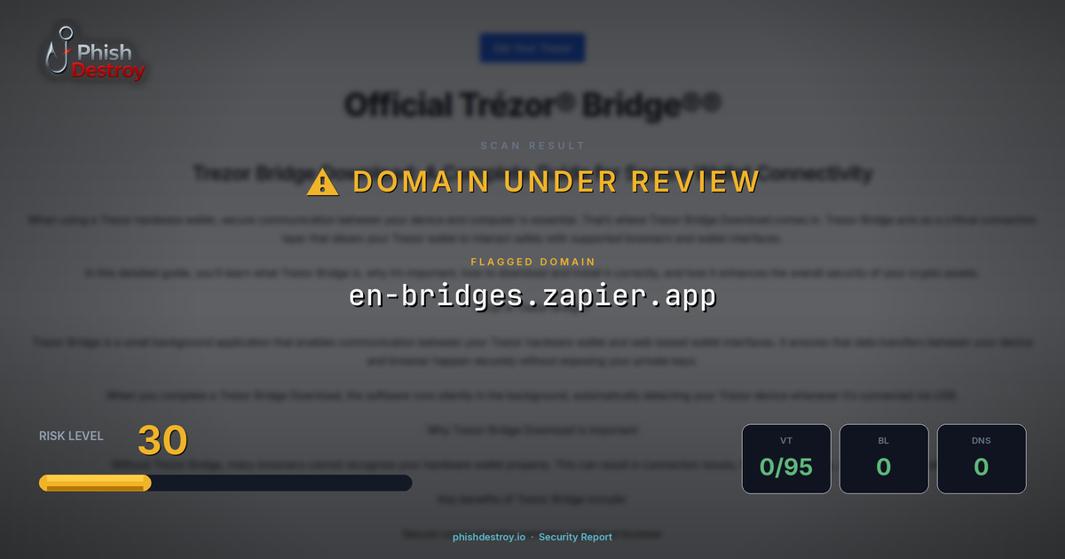 en-bridges.zapier.app has been listed on PhishDestroy as a suspicious domain. Scanned by 95 security vendors — automated detections may take time to update. PhishDestroy threat analysts continue to monitor this domain.