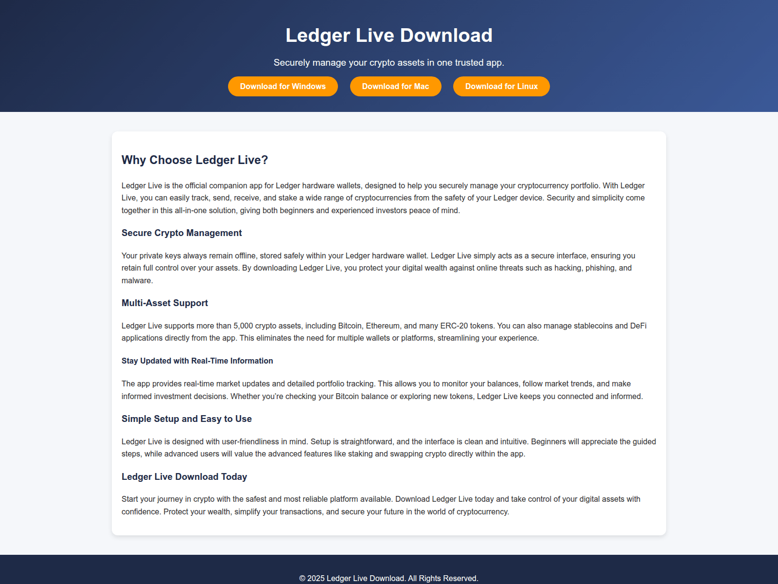 The site displays a page titled “Ledger Live Download - Secure Your Crypto Assets”.