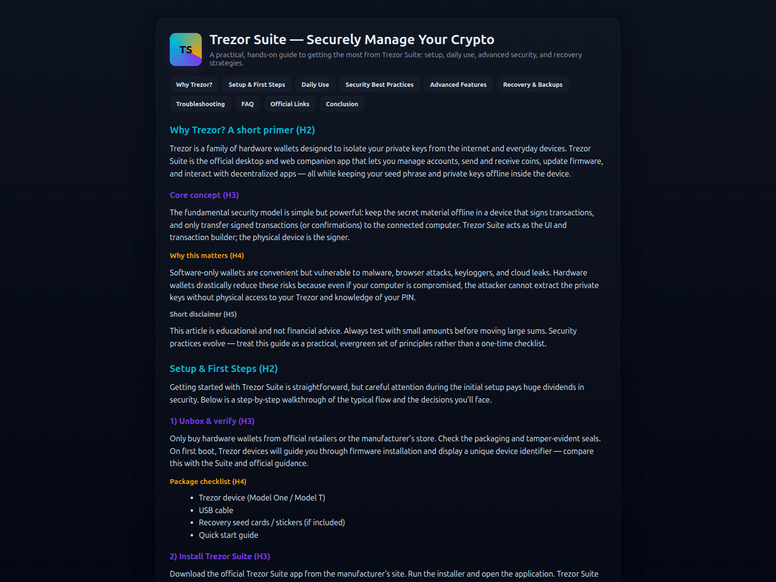 - Use a hardware wallet (Ledger, Trezor). Never store large amounts in browser wallets