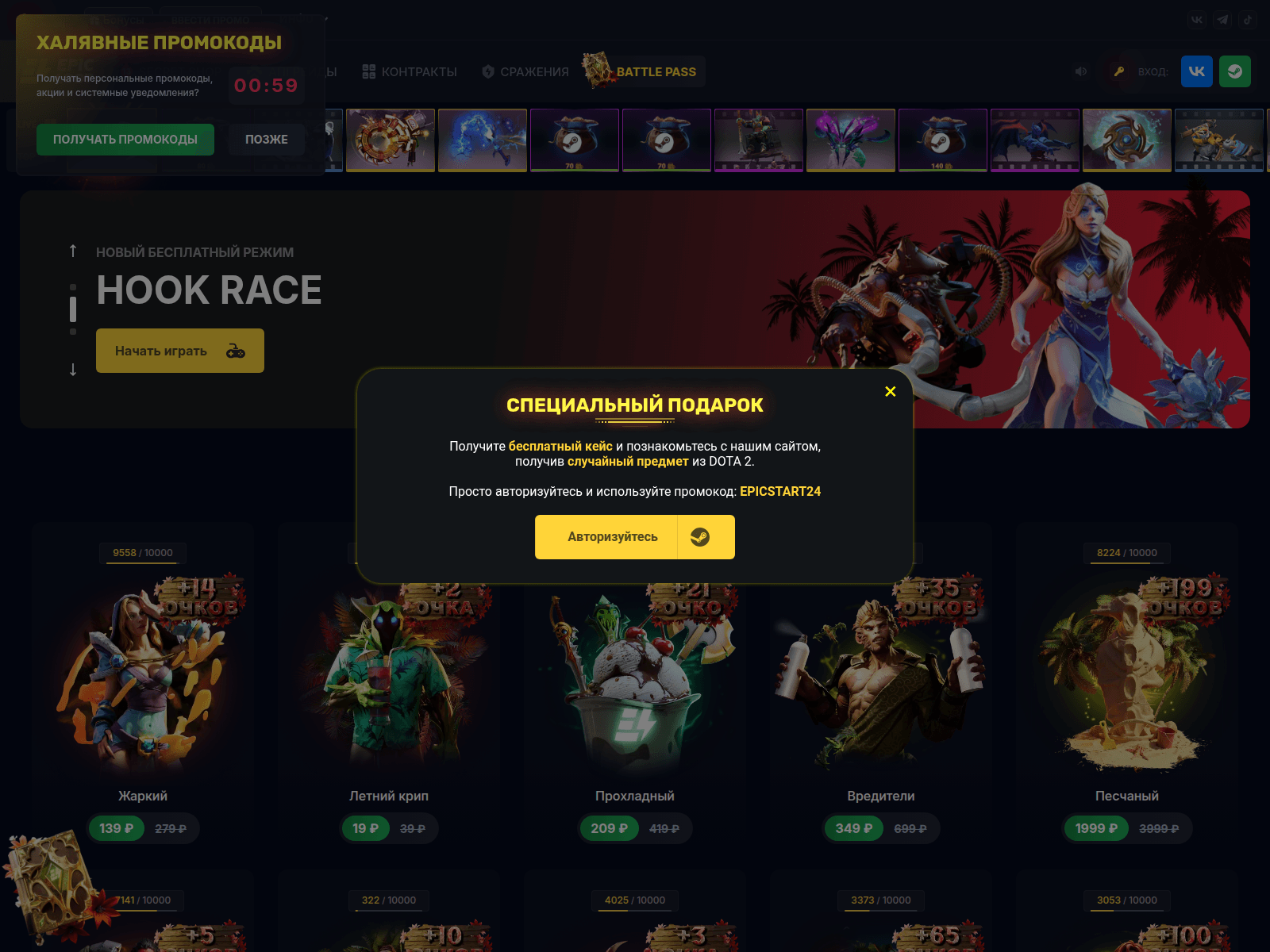 The site displays a page titled “EPIC-LOOT — ÐÑиÑиалÑнÑй СайÑ: ÐейÑÑ Dota 2 и ÐÑканÑ!”.