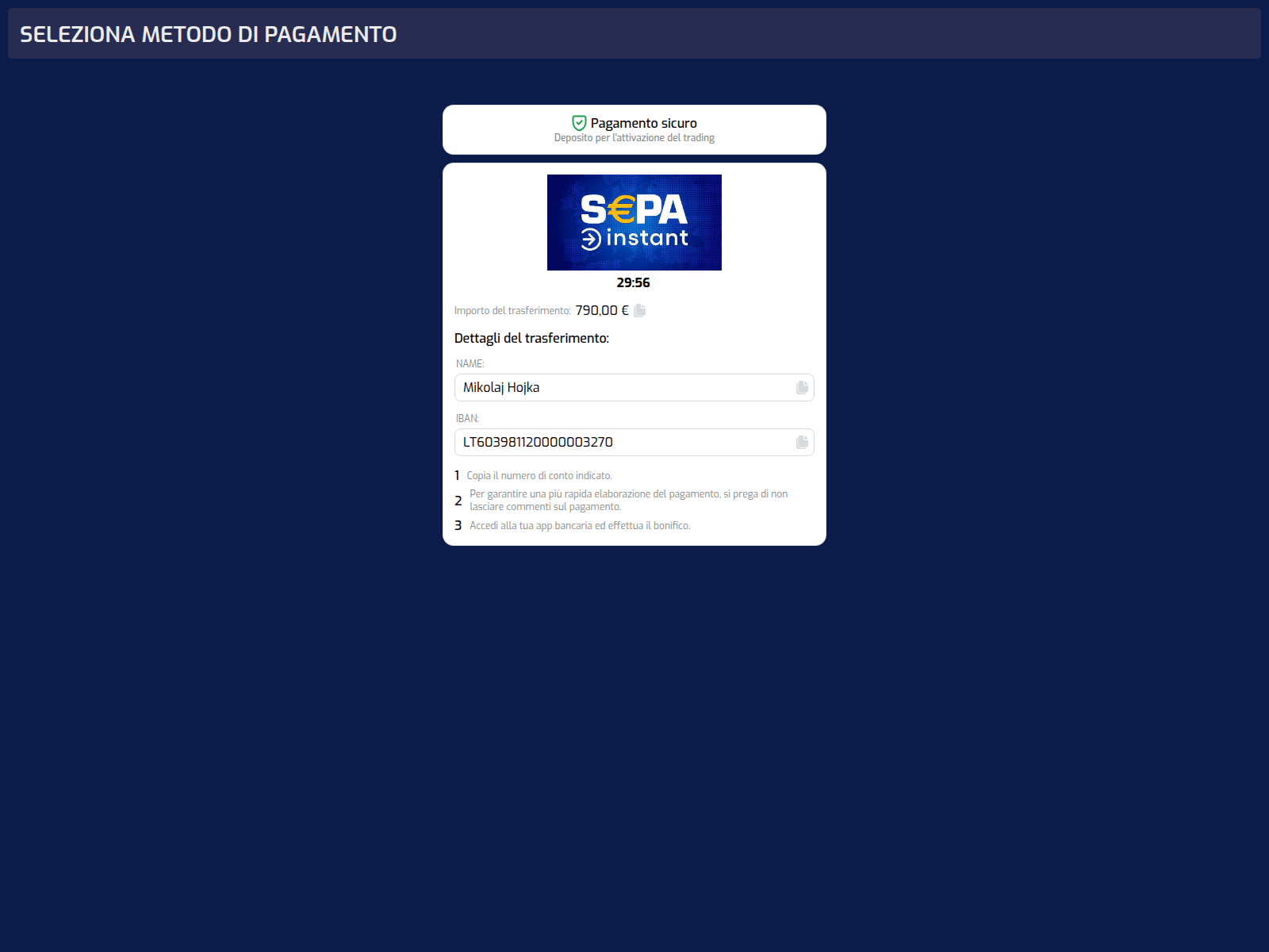 The site displays a page titled “Deposito per l'attivazione del trading”.