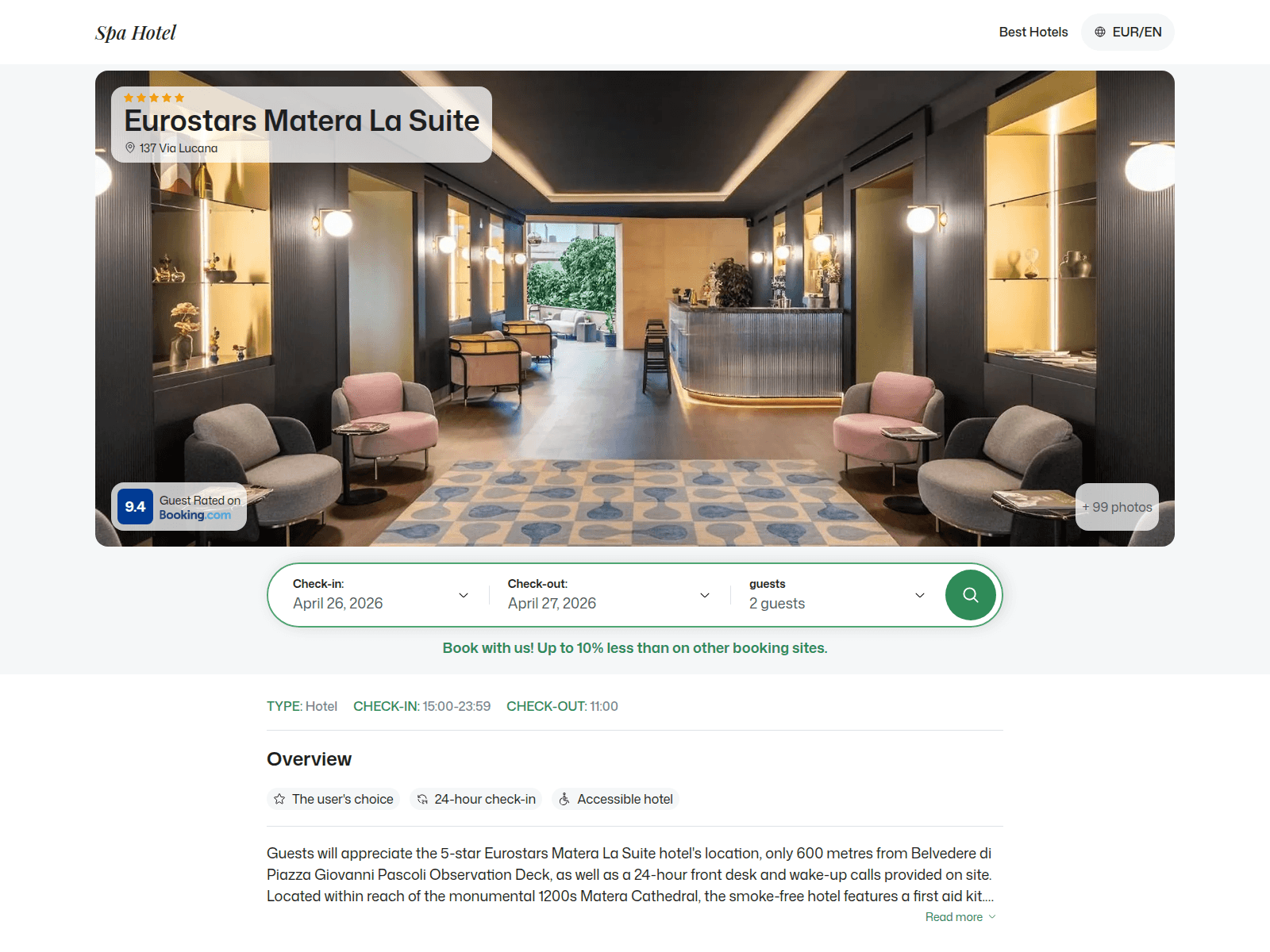 The site displays a page titled “Eurostars Matera La Suite - Matera, Italy”, which may be designed to impersonate Sui.