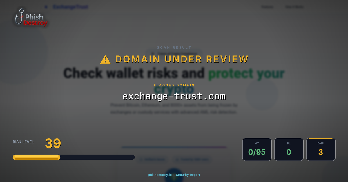 This domain security report for exchange-trust.com is maintained by PhishDestroy's automated threat intelligence pipeline. Our system continuously monitors this domain across 95 security vendors on VirusTotal, 1 public blocklists, and Google Safe Browsing.