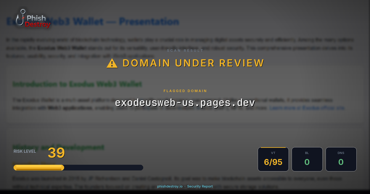 This domain security report for exodeusweb-us.pages.dev is maintained by PhishDestroy's automated threat intelligence pipeline. Our system continuously monitors this domain across 6 security vendors on VirusTotal, 1 public blocklists.