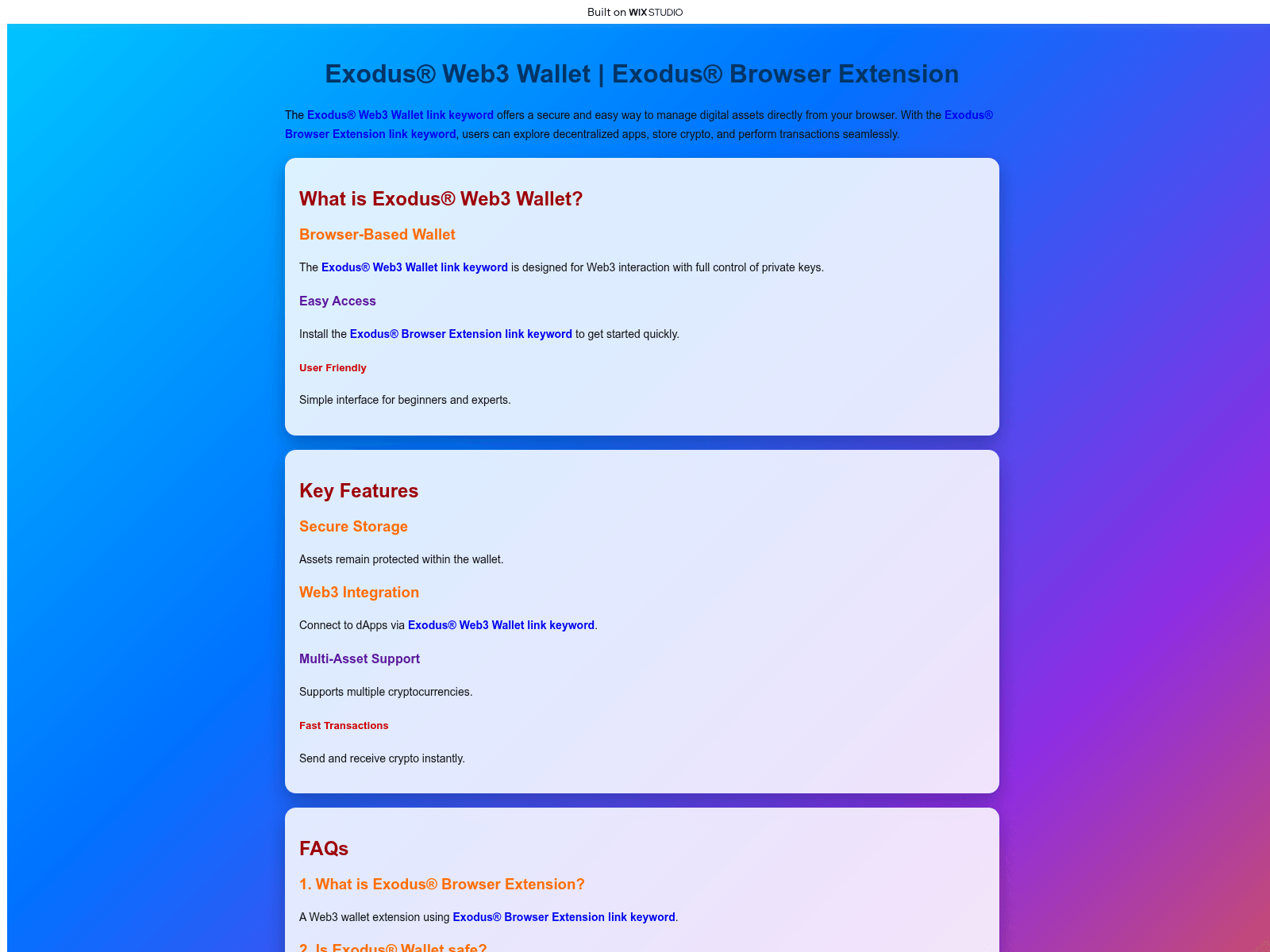 The domain explore-exodos-learn[.]wixstudio[.]com has been identified as a cryptocurrency phishing website. This malicious site targets Web3 users by mimicking legitimate crypto platforms to steal wallet credentials and digital assets.